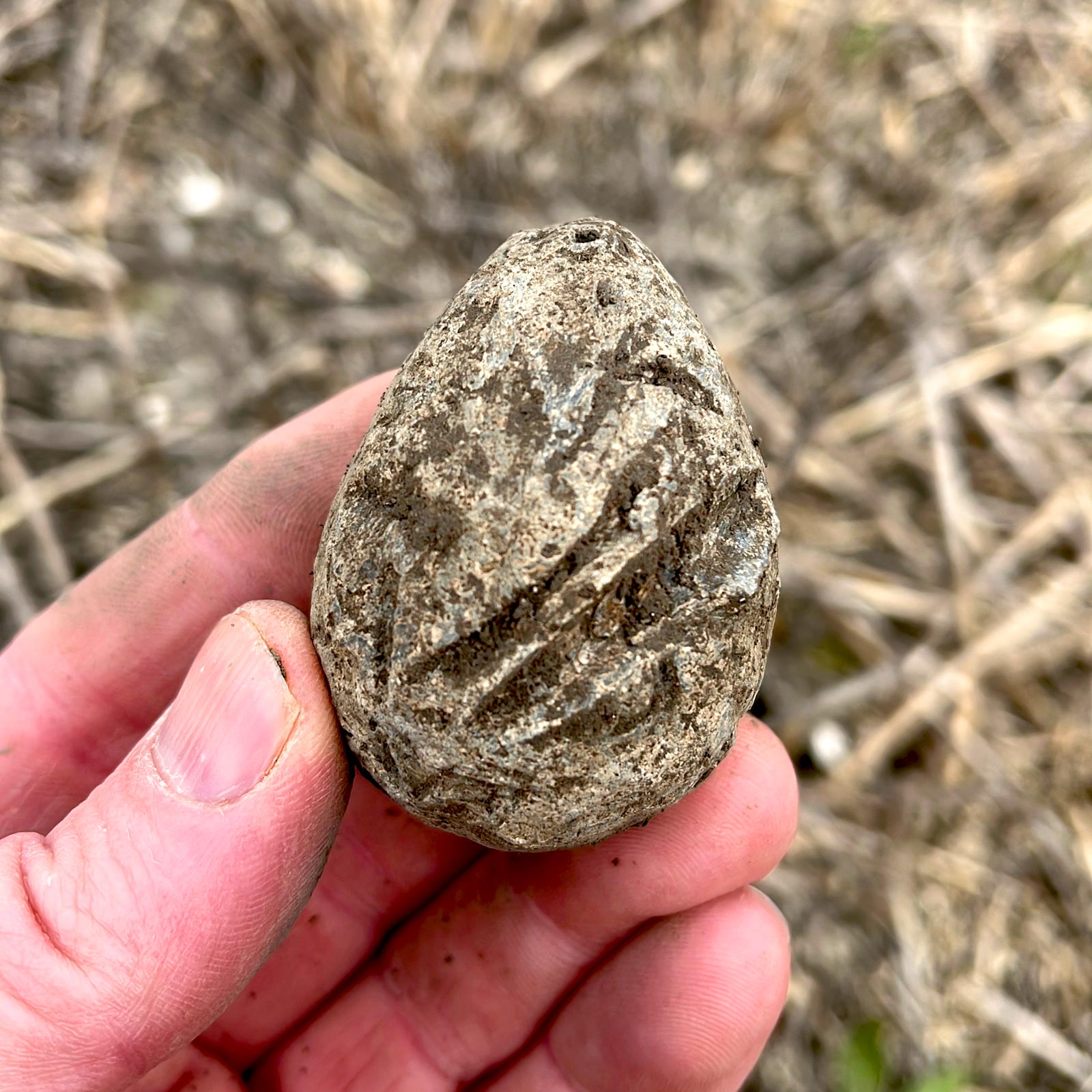 I carried on for a bit longer before the weather stopped play for the day, but a few more bits did come up, including a Zippo-style lighter with the initials RKF on it (Fig. 23). I also had part of a barrel tap, a lead seal, a possible lead spindle whorl, a musket ball, the shaft of an old straw splitter, a car tyre valve, a few more buttons, and a possible half of a strap end (Fig. 24). I also had a mystery object which left me a bit stumped, but it looked to have some age to it due to the patina, so maybe it’s a broken part of something a reader might recognise? (Fig. 25).